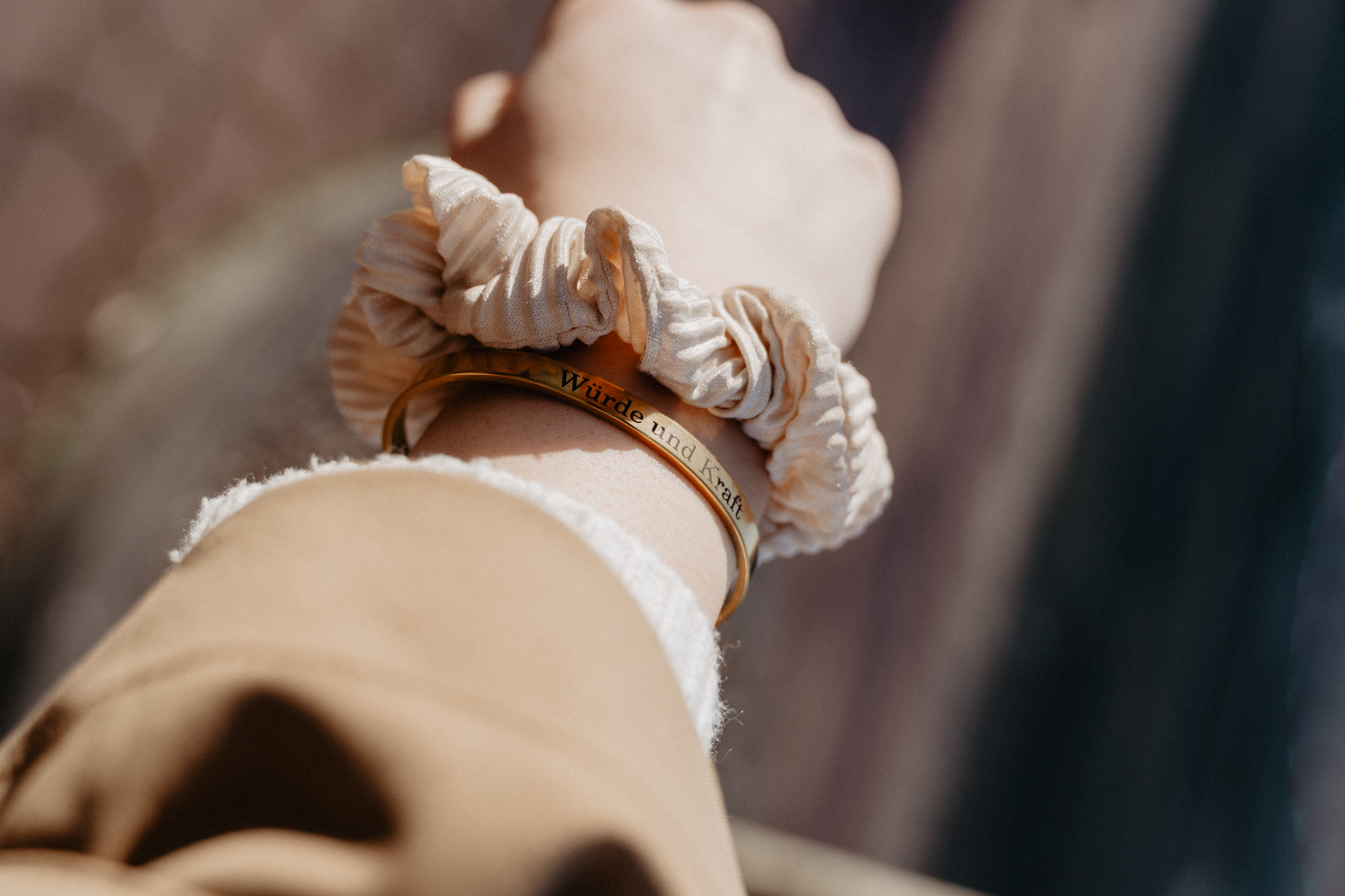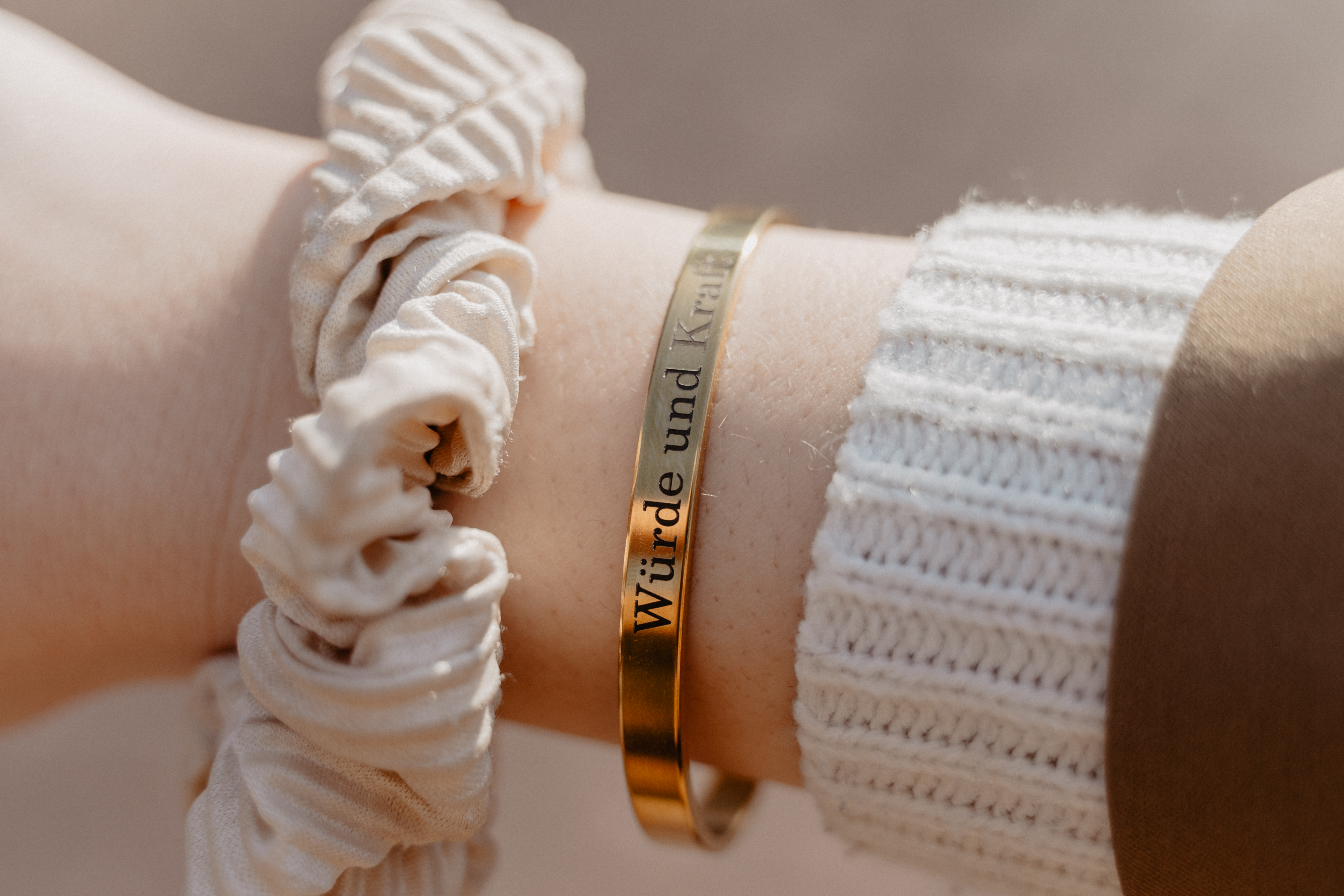 Goldener Armreif mit eingraviertem Text: „Würde und Kraft“